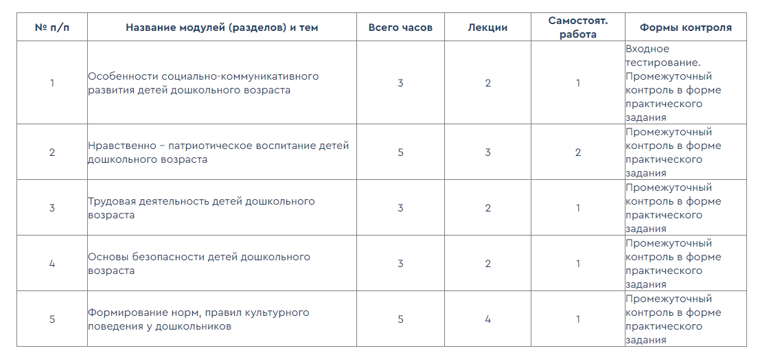 | 5 | Формирование норм, правил культурного поведения у дошкольников | 5 | 4 | 1 | Промежуточный контроль в форме практического задания |